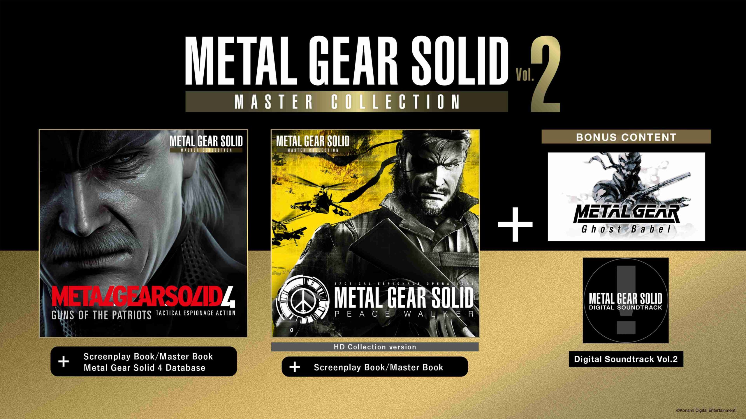 Koleksi ini adalah sekuel dari METAL GEAR SOLID: MASTER COLLECTION Vol.1 memperkenalkan kembali dua game yang harus dimainkan untuk kelanjutan kisah Solid Snake dan Big Boss. Metal Gear Solid 4: Guns of the Patriots, membuat port pertamanya sejak rilis original di tahun 2008, bersamaan dengan Metal Gear Solid: Peace Walker berfitur gameplay hingga enam pemain online*, dan spin-off Metal Gear: Ghost Babel sebagai bonus konten.