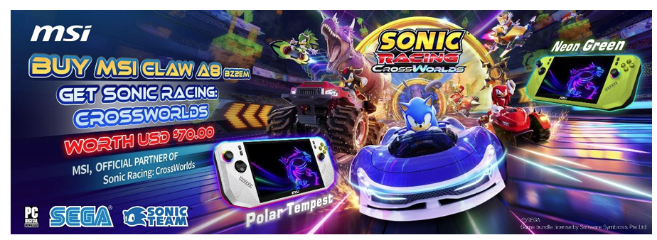 MSI resmi mengumumkan kolaborasi spektakuler dengan SEGA lewat paket bundel eksklusif untuk para gamer. Dalam periode promosi terbatas, setiap pembelian handheld gaming terbaru MSI Claw A8 akan mendapatkan salinan digital gratis game Sonic Racing: CrossWorlds untuk PC. Promo ini berlangsung mulai 26 September hingga 31 Oktober 2025, selama persediaan masih ada.
