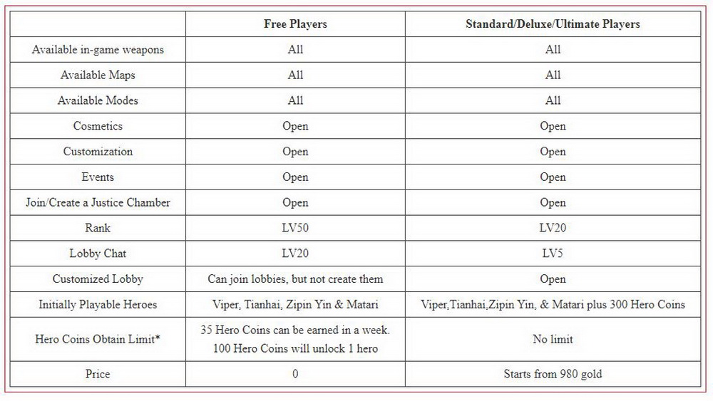 Dilansir dari website resminya, telah tercantum konten apa saja yang akan didapat oleh versi F2P dan bedanya dengan edisi standard, deluxe, dan ultimate: