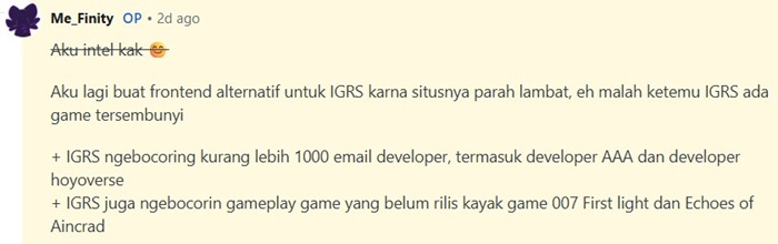 “IGRS, sejauh yang saya lihat, memproses setiap pengajuan secara manual. Saya tidak akan heran jika beberapa tautan akhirnya terbuka lebih luas di tengah proses ini.” Ujarnya.