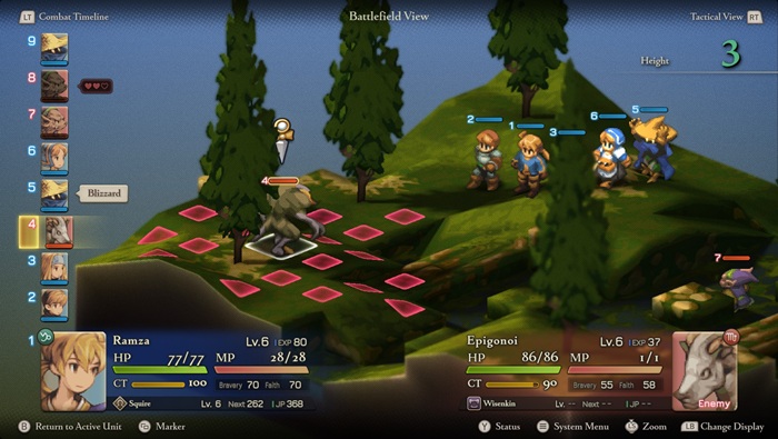 Sekali lagi kami dibawa ke medan pertempuran berbentuk persegi panjang yang memiliki desain bentang alam bermacam-macam. Dimana setiap langkah Ramza dan pasukannya diwakili oleh CT (Charge Time) serta persegi penanda lokasi karakter. Semakin cepat CT terisi, semakin cepat pula giliran karakter untuk bergerak tiba, entah itu musuh atau tim Ramza.