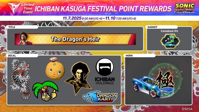 Selain itu, mulai dari 7 November 2025, game ini juga akan menggelar event kolaborasi terbatas bertajuk Ichiban Kasuga Festival, yang memungkinkan pemain mengumpulkan Festival Points untuk mendapatkan berbagai item eksklusif di dalam game.